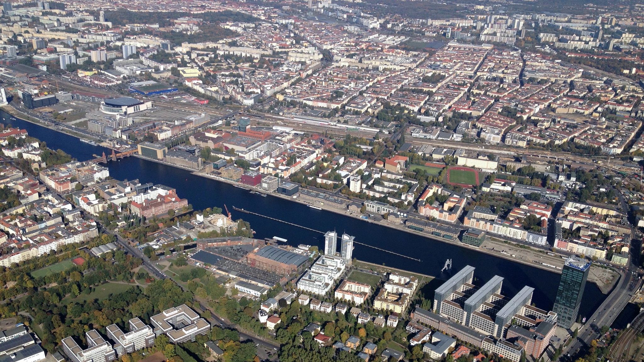 Die Spree mit der Oberbaumbrücke, der Uber-Arena und den Twin-Towers